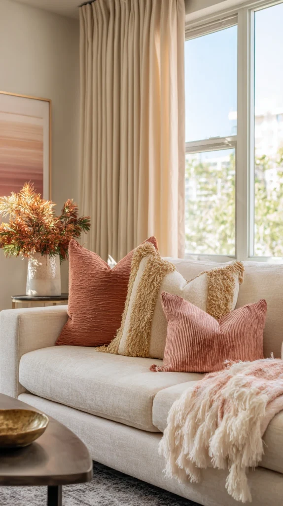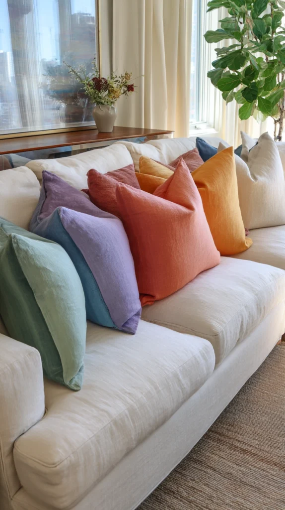 A neutral sofa — cream, oatmeal, warm white, or natural linen — dressed with a carefully sequenced gradient of throw pillows moving through the full spectrum from one arm to the other creates a rainbow decorative statement of remarkable elegance and remarkable restraint that works in virtually any living room regardless of its existing colour scheme or its existing level of decorative formality.