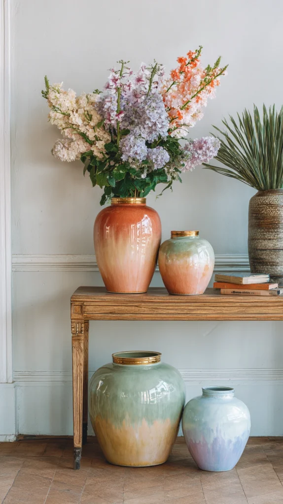 A collection of ceramic objects — vases, bowls, planters, and vessels of varying sizes and forms — arranged across a shelf, mantelpiece, or sideboard in a deliberate colour gradient from one end of the spectrum to the other creates a rainbow display of extraordinary refinement and extraordinary material beauty.