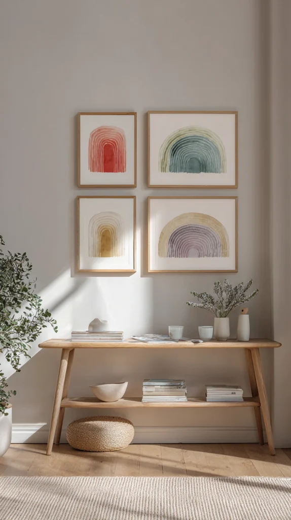 A gallery wall whose prints and artworks are chosen for their colour rather than their subject — arranged in a sequence that moves through the spectrum from one edge of the wall to the other, framed consistently in simple natural timber or matte white for visual coherence — creates a rainbow decorative statement of considerable gallery-quality sophistication and considerable chromatic joy.