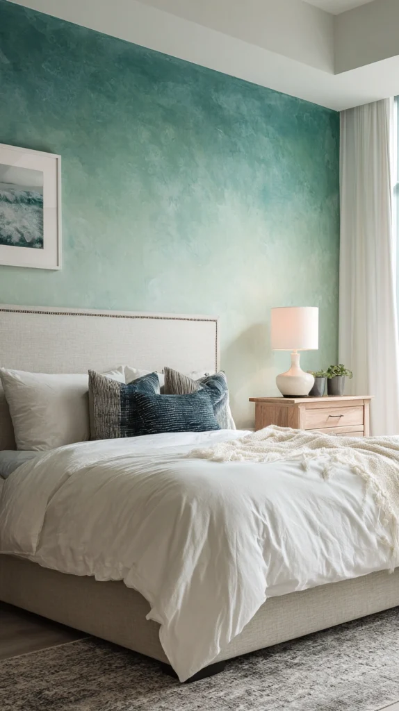 The ombre wall works best when the colours chosen are closely related rather than dramatically contrasting — deep teal blending into sage green, warm terracotta dissolving into dusty rose, rich indigo transitioning into soft lavender.