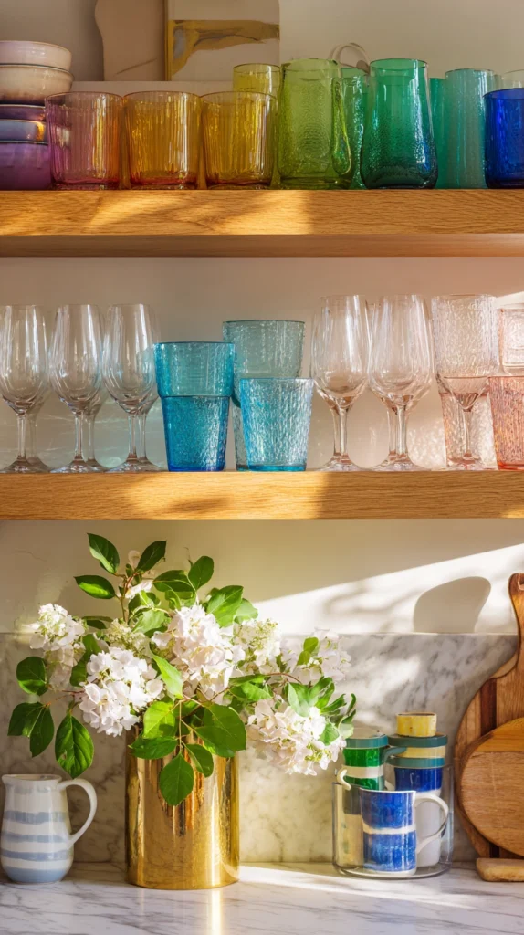 A collection of coloured glassware — wine glasses, tumblers, bud vases, and decorative vessels in a considered selection of spectrum colours — displayed on an open kitchen shelf, a bar cart, or a dining table sideboard creates a rainbow decorative moment of extraordinary lightness, extraordinary translucency, and extraordinary chromatic richness that no opaque material can replicate.
