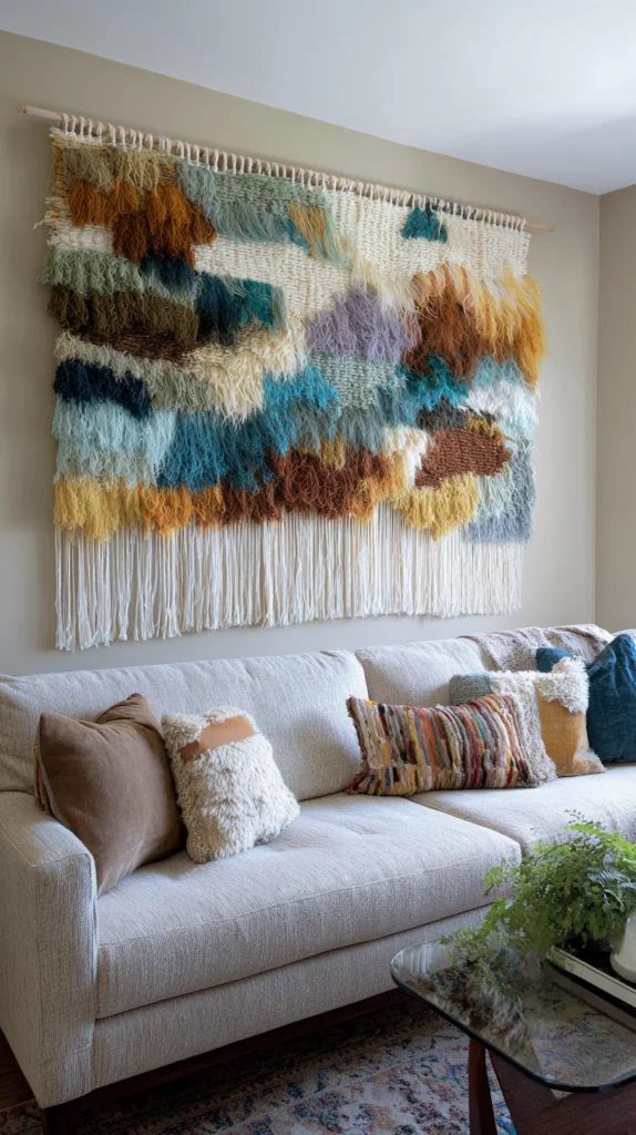 The woven wall hanging works as rainbow decor because weaving is a medium that inherently softens and integrates colour — the intersecting threads of different hues create a visual blending effect at the point of contact that produces a rainbow far more nuanced, far more natural, and far more genuinely beautiful than any flat printed or painted surface can achieve.