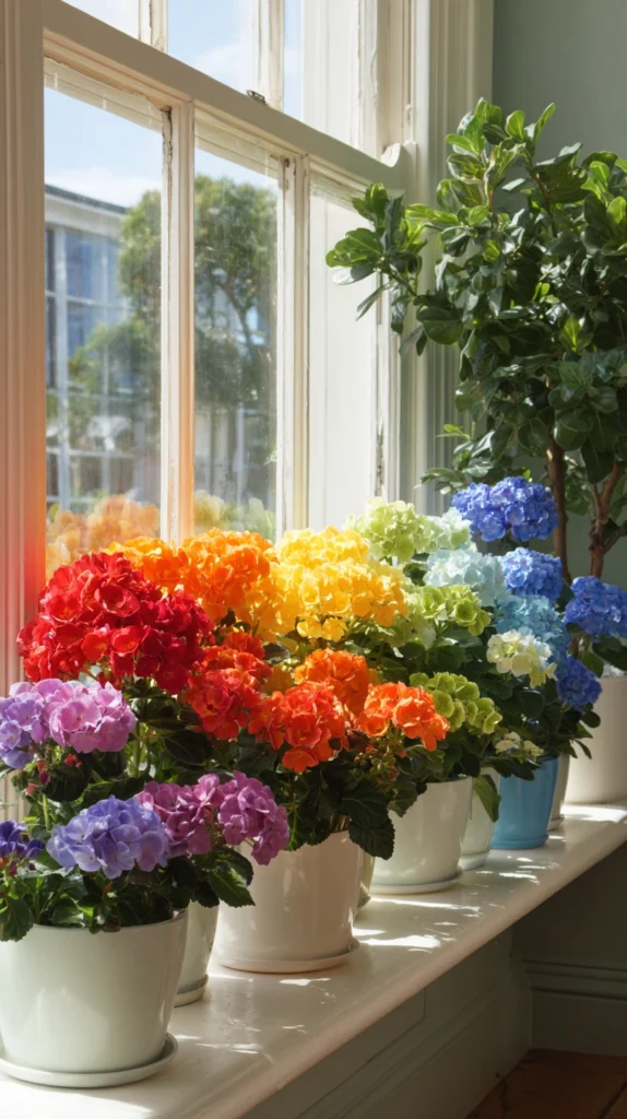 A sequence of potted plants arranged along a windowsill, a mantelpiece, or a set of open shelves — chosen specifically for the colour of their flowers and arranged in a deliberate spectrum sequence from warm reds and oranges through yellows and greens to cooler blues and purples — creates a living rainbow of extraordinary natural beauty and extraordinary seasonal dynamism.
