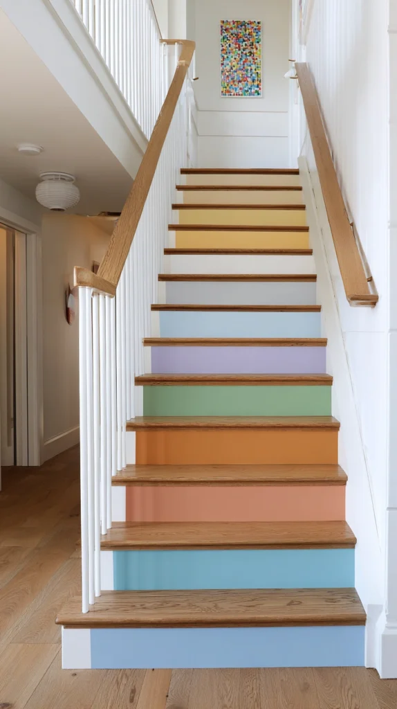 The painted stair riser gradient works best in a home whose overall palette is relatively neutral — white walls, natural timber floors, simple furnishings — where the rainbow staircase can perform its colour magic without competing with any other chromatic statement in the surrounding space. Paint each riser in a matte finish of genuine quality for a result that photographs beautifully and wears gracefully.