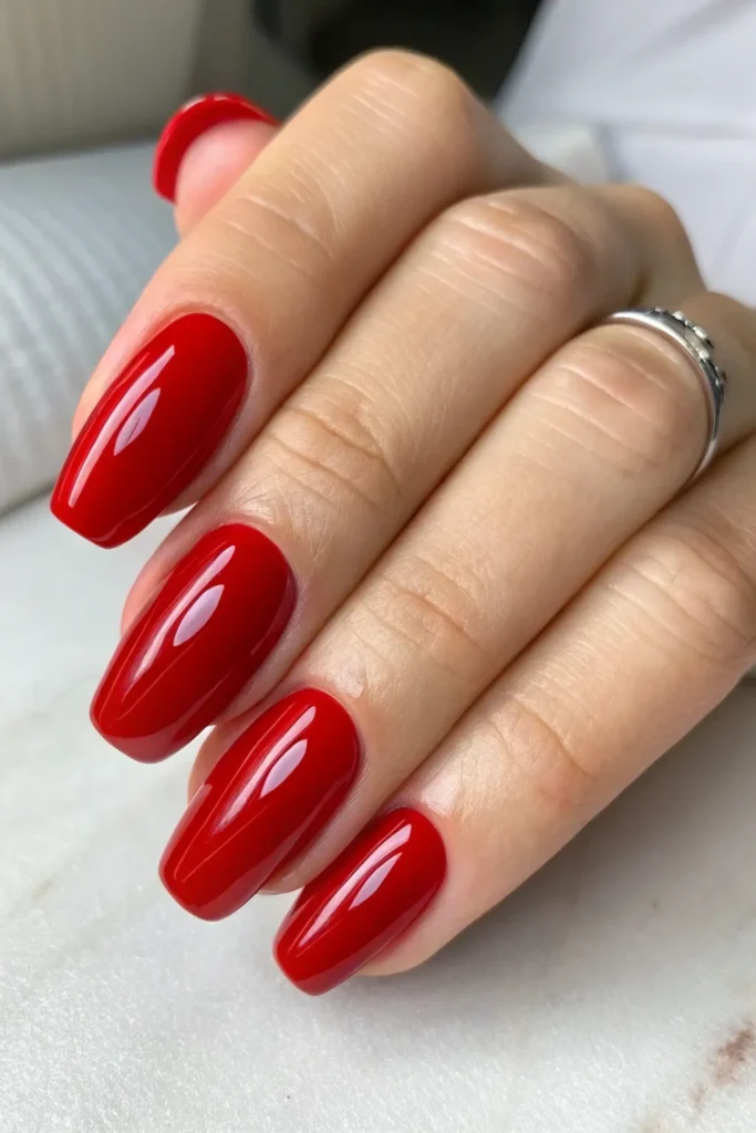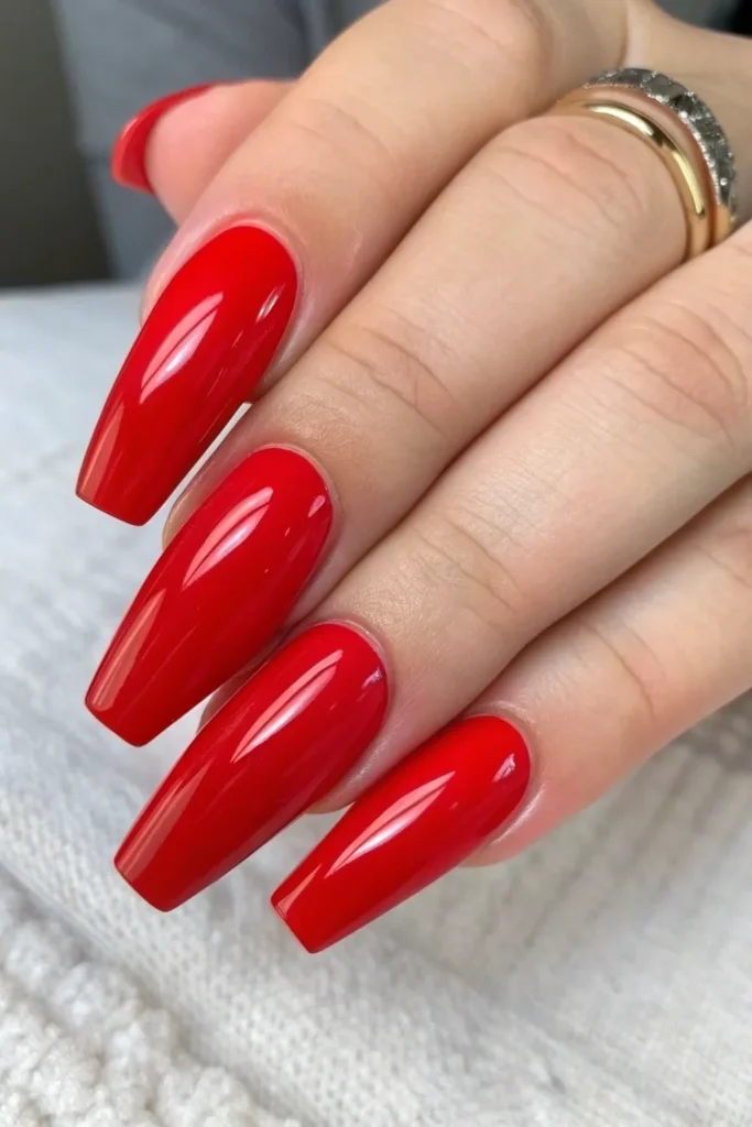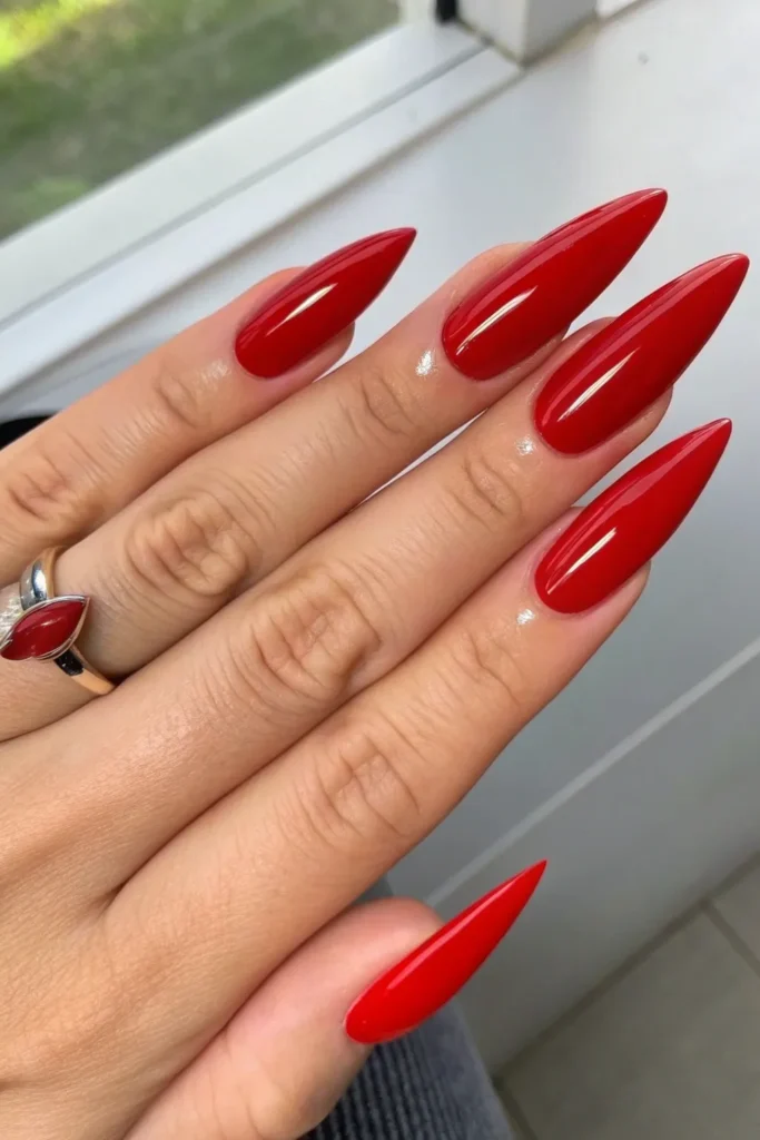 Stiletto nails are already a bold shape, and when paired with a rich red shade, they become absolutely show-stopping. These nails elongate the fingers and give a powerful, edgy feel. They’re perfect for those who love dramatic styles and want a manicure that instantly commands attention. Add a touch of glitter or crystals if you want extra sparkle.