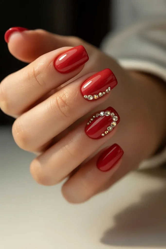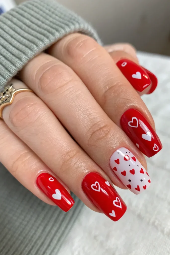 Heart designs add a sweet, romantic touch to your manicure. This style is perfect for Valentine’s Day or any time you want to express a soft, playful vibe. You can add tiny heart decals, painted hearts, or even heart-shaped rhinestones on one or two accent nails. The contrast between bold red and the delicate heart motifs creates a charming look.