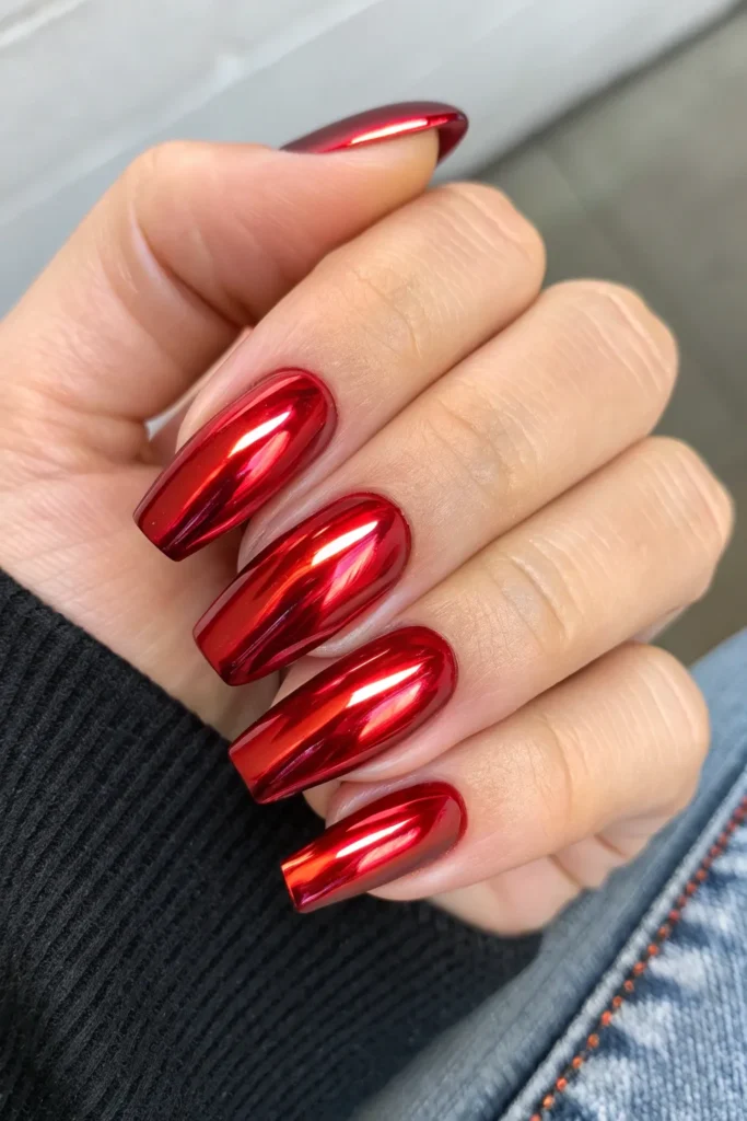 Chrome nails create a reflective, metallic effect that feels futuristic and high-fashion. Red chrome acrylics are eye-catching, vibrant, and incredibly stylish. This manicure shines beautifully under lights and looks stunning in photos. If you want a manicure that feels modern, glamorous, and luxurious, chrome red nails are a perfect choice.