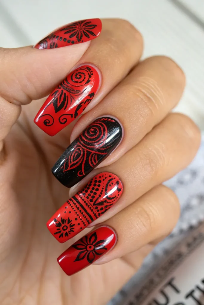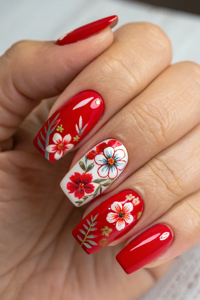 Floral patterns add a touch of femininity and elegance to any red manicure. From hand-painted roses to delicate 3D flowers, this design is perfect for spring, summer, weddings, or any romantic occasion. Red provides a bold backdrop, making the floral patterns stand out beautifully. The combination is artistic, soft, and effortlessly chic.