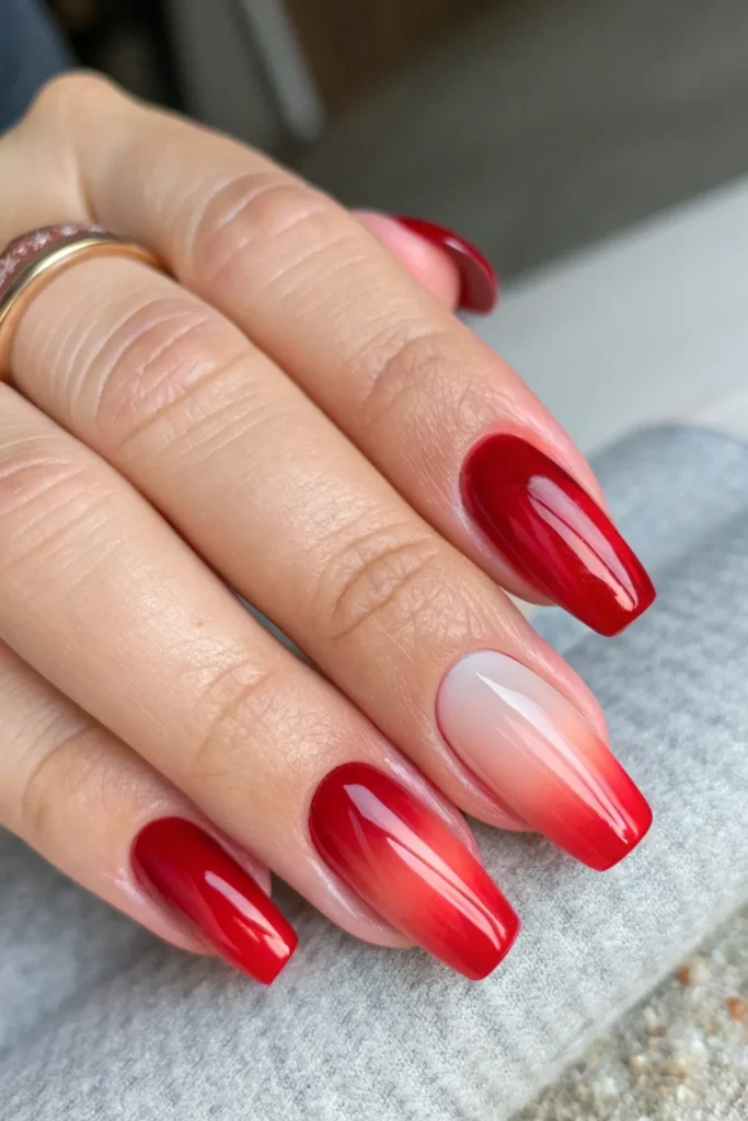 Red ombré nails blend different tones to create a gradient effect that looks smooth and captivating. You can pair red with black, white, nude, or even pink to make unique and stylish gradients. This design is great for anyone who wants something visually dynamic without adding too many details. It’s modern, versatile, and always fashionable.