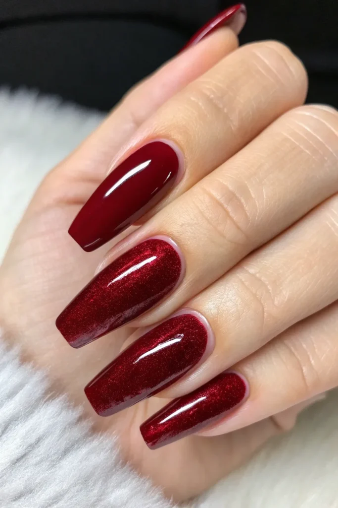 Velvet nails mimic the soft, luxurious look of velvet fabric and have become one of the hottest nail trends. The effect is created using magnetic polish, giving your nails a velvety, shimmery texture that changes under light. Red velvet nails look rich, glamorous, and unique—perfect for the holiday season or any time you want a luxurious, eye-catching manicure.