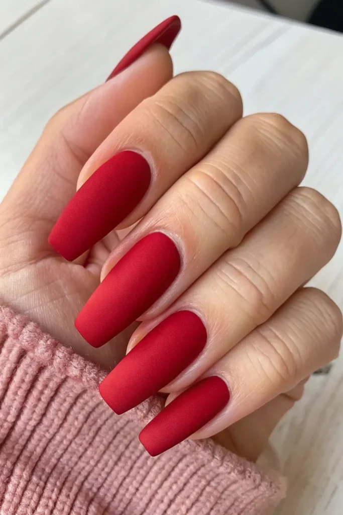 If you’re looking for something trendy with a contemporary feel, matte red nails are the perfect option. The matte finish softens the intensity of the color while still making a strong visual impact. This style gives off a luxurious vibe and pairs well with gold rings or minimalist accessories. For added dimension, try mixing matte and glossy textures on alternating nails.