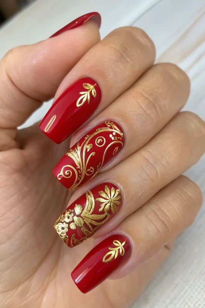 Gold and red are a glamorous duo. Adding gold foil, lines, flakes, or metallic patterns instantly elevates your manicure, giving it a luxurious, festive feel. This design works beautifully for holidays like Christmas and New Year’s, but it’s also stunning for weddings, parties, or any event where you want your nails to shine.