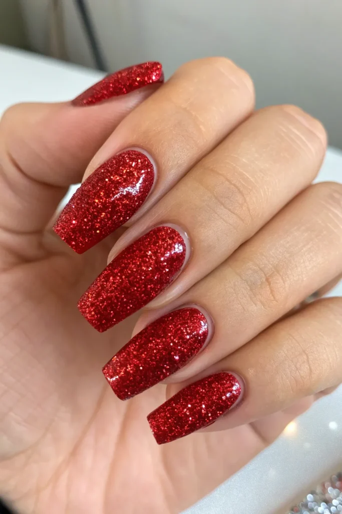 If you love sparkle, red glitter acrylics are the perfect choice. Whether you choose chunky glitter, fine shimmer, or a full glitter ombré, the light-catching effect is mesmerizing. This design is ideal for celebrations or when you simply want your nails to light up your look. Red glitter is bold, joyful, and irresistibly glamorous.