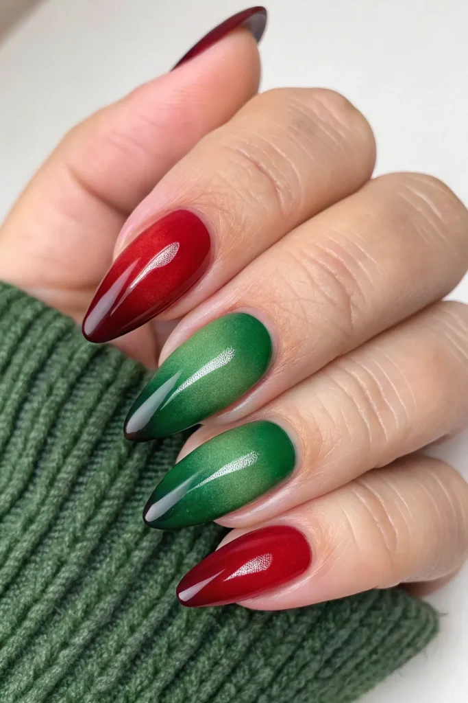 Create a magical fade from deep red to rich green, blending the two hues like a cozy Christmas gradient.