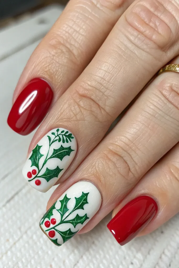 Go classic with bright red nails decorated with hand-painted holly leaves and berries. This design feels cozy and festive.