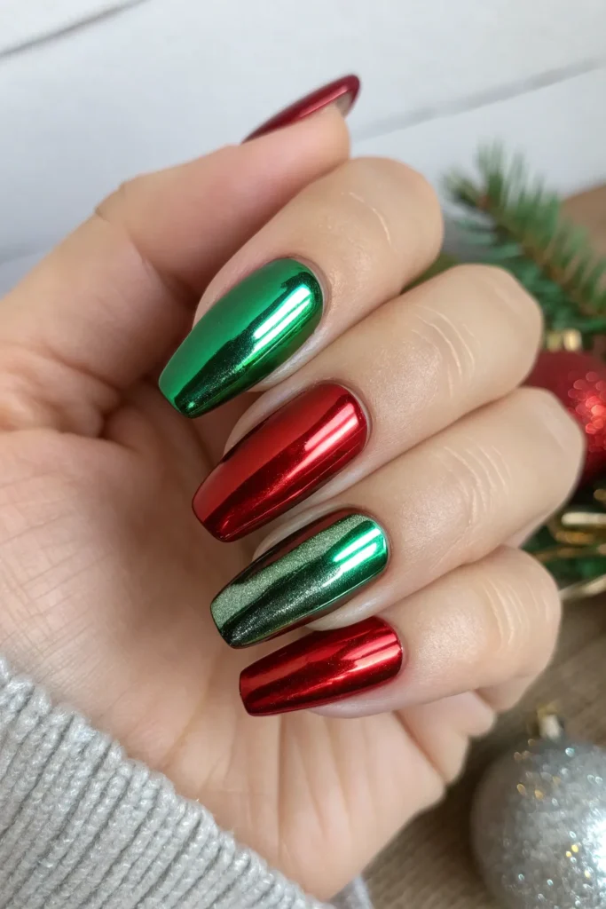 Metallic nails are perfect for the holidays. Mix chrome red and chrome green for a glossy, mirror-like effect.