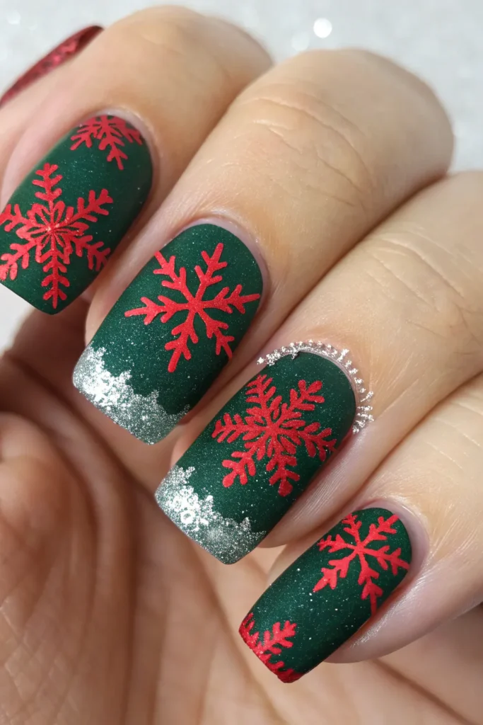 Flip the usual color scheme by painting snowflakes in red over a dark green base. It’s bold, creative, and eye-catching.