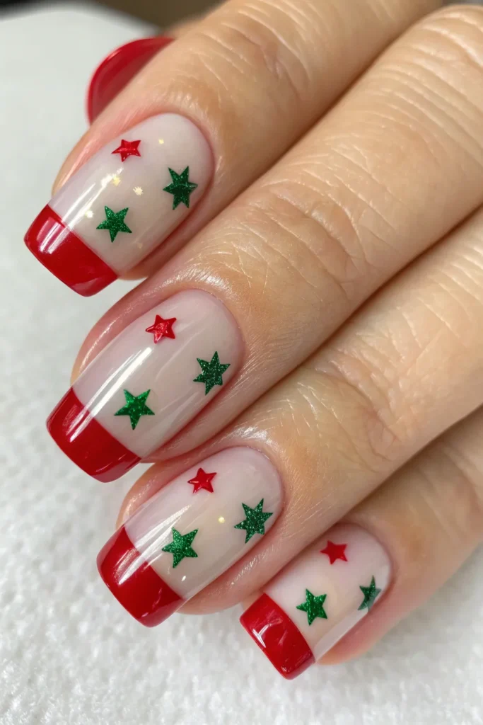 A modern take on Christmas nails—classic red French tips decorated with tiny green stars.