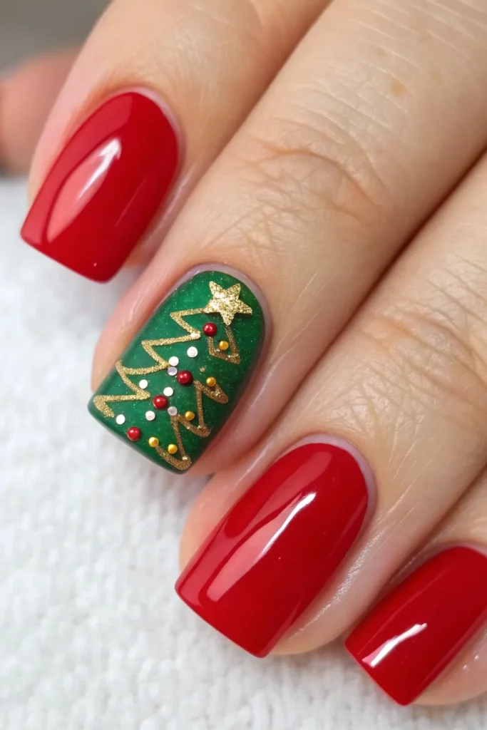 Keep most nails red and add one accent nail featuring a mini Christmas tree using green polish and gold sparkles.