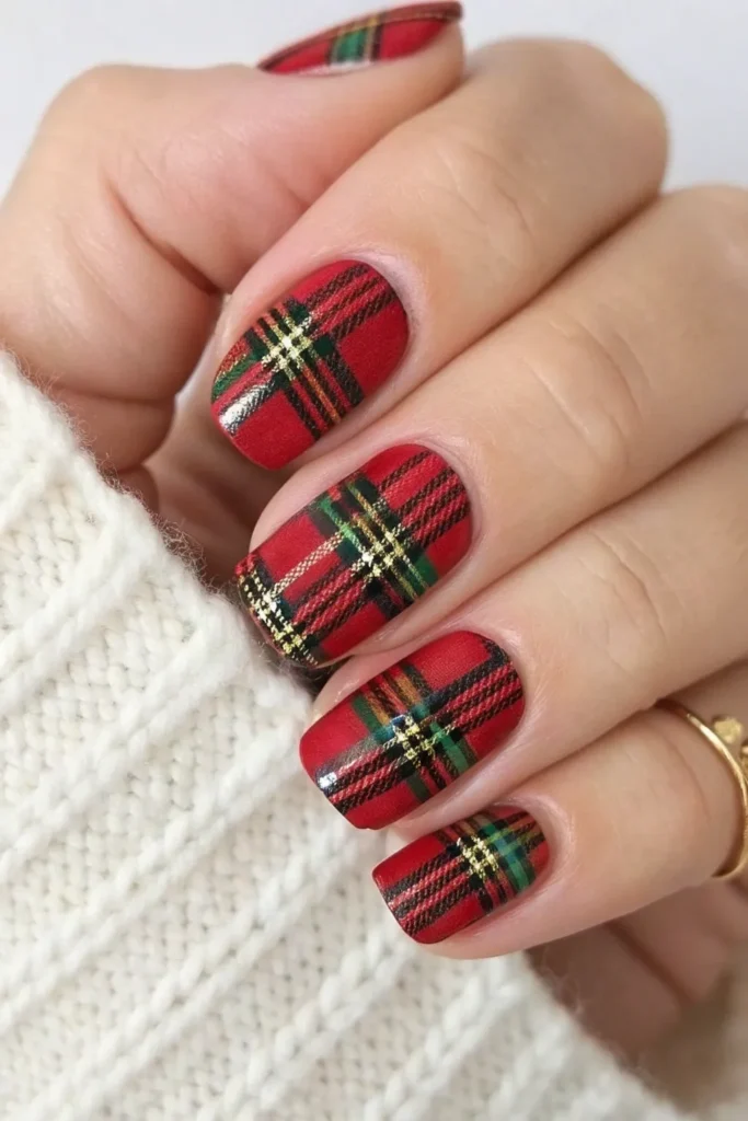 Plaid is the pattern of the season, and it looks amazing on nails. Try red and green plaid designs with thin black or gold lines for a cozy winter feel.