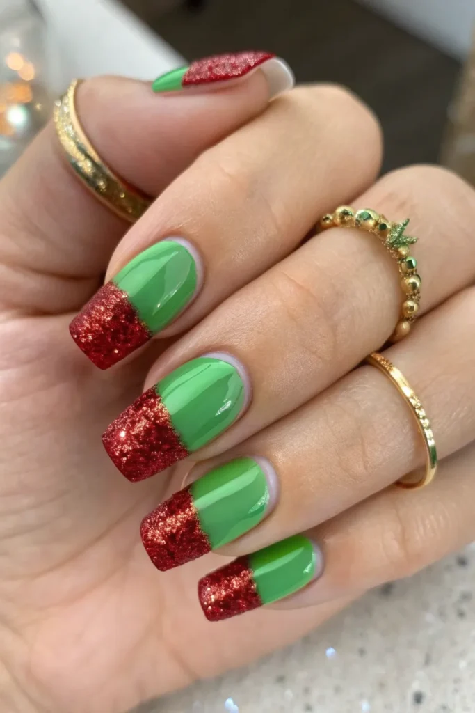 Switch things up with green French tips and red glittery accent nails. It’s a classy twist on the traditional French manicure.