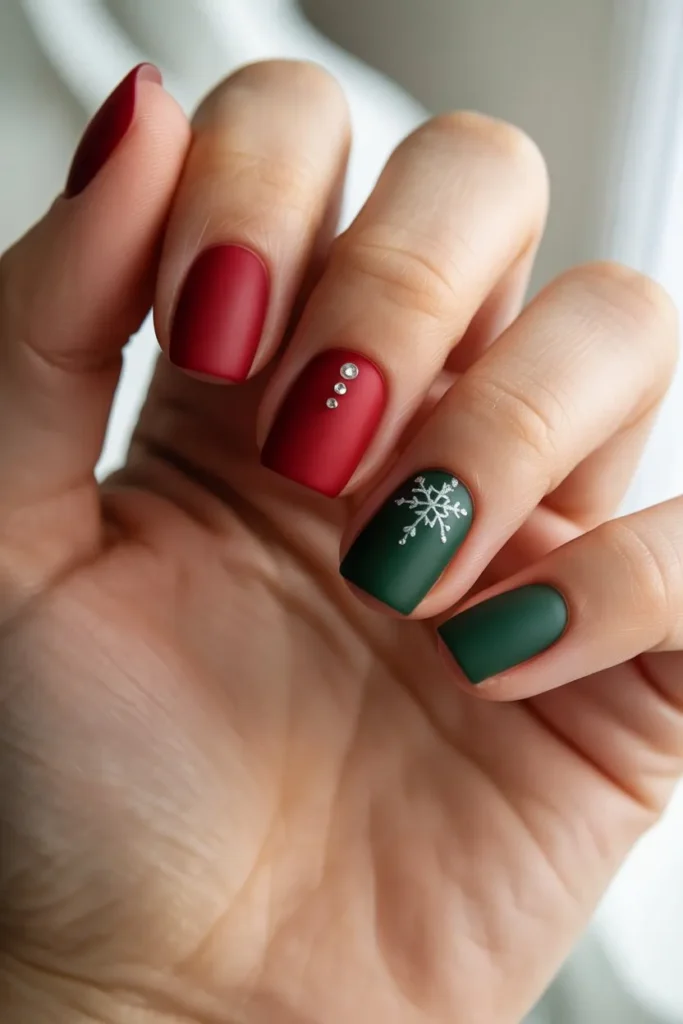 Matte nails look chic and modern, especially in festive shades. Alternate between matte red and matte green nails for a trendy, minimal look.