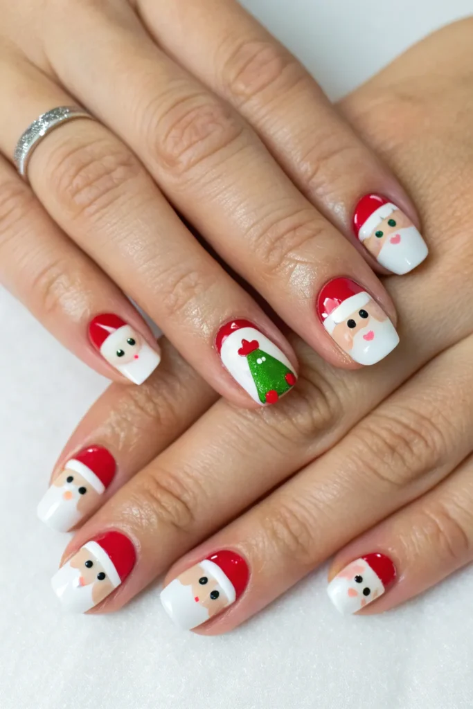 Add a cute touch with tiny Santa hats on your nails using red, white, and a hint of green. It’s playful and perfect for the season.