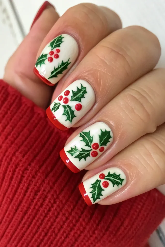 Add a festive twist with mistletoe art over a white or nude base, combining green leaves and red berries.