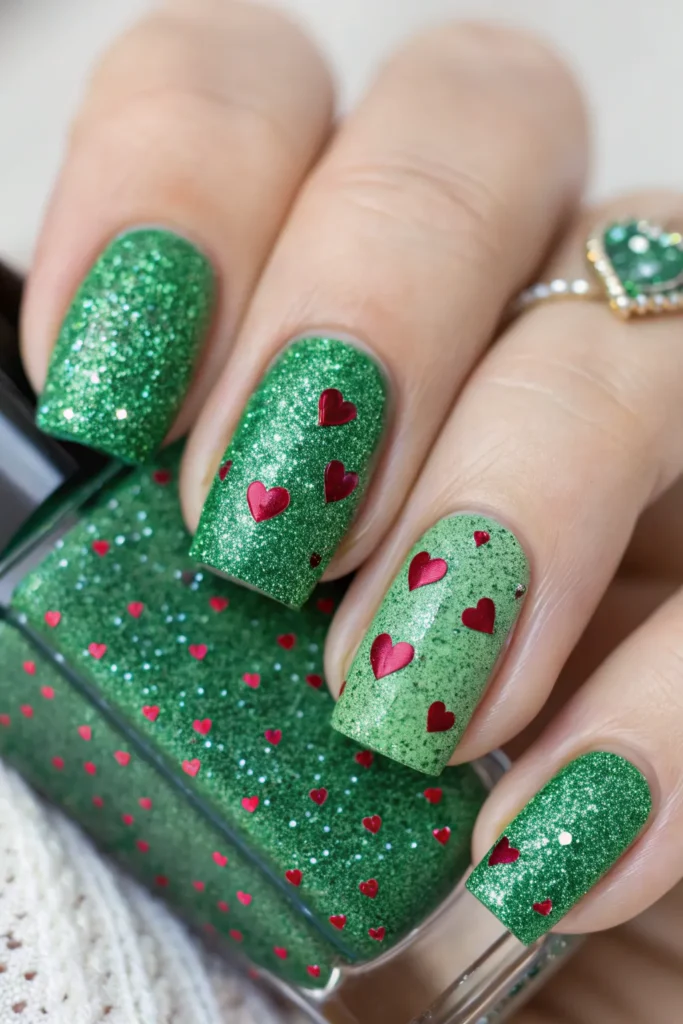 A full green glitter manicure with subtle red details, like hearts or dots, feels joyful and glamorous.