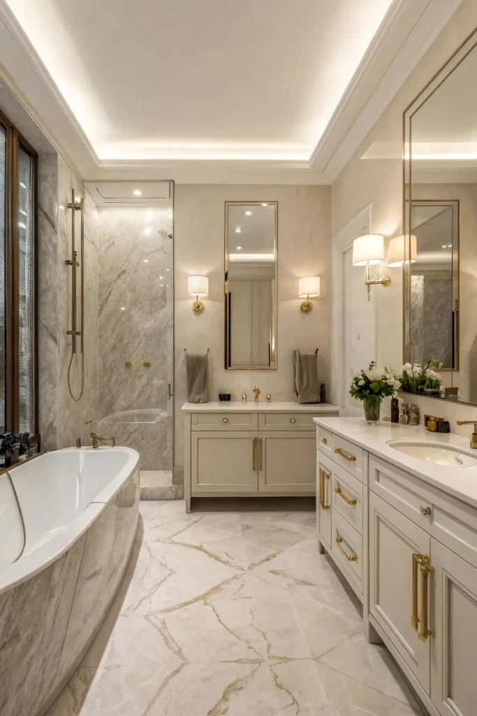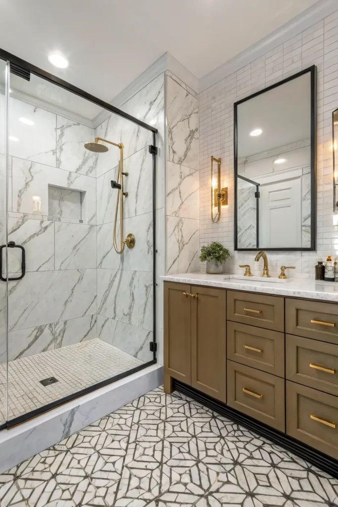 Run marble tile floor-to-ceiling in the shower or on a feature wall behind the vanity. Add brushed gold or matte black fixtures for a high-contrast, Instagram-worthy finish.