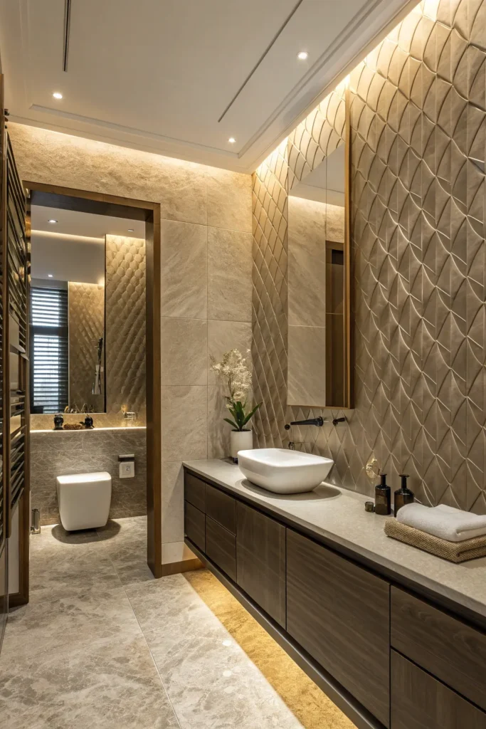Modern bathrooms benefit from subtle texture like fluted panels, micro-cement, or ribbed tiles. These finishes add depth without overwhelming the minimalist aesthetic.