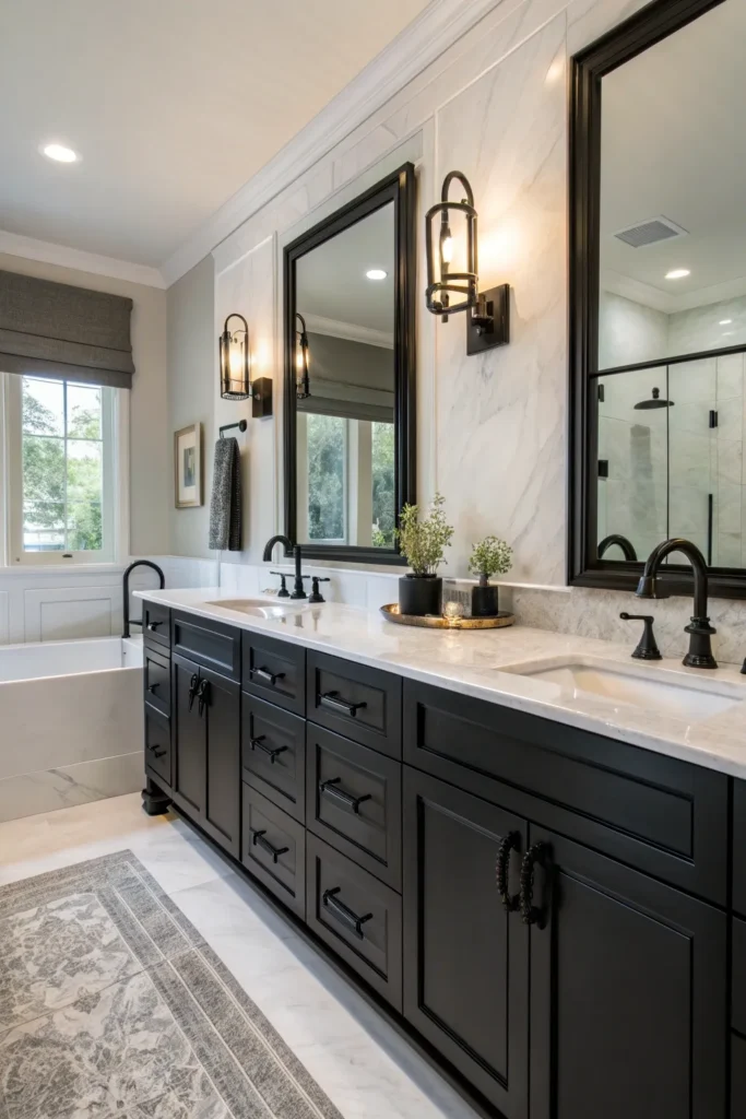 From faucets to shower frames and cabinet handles, incorporating black adds sophistication and visual depth. Balance the look with warm woods or soft lighting to keep the space cozy.