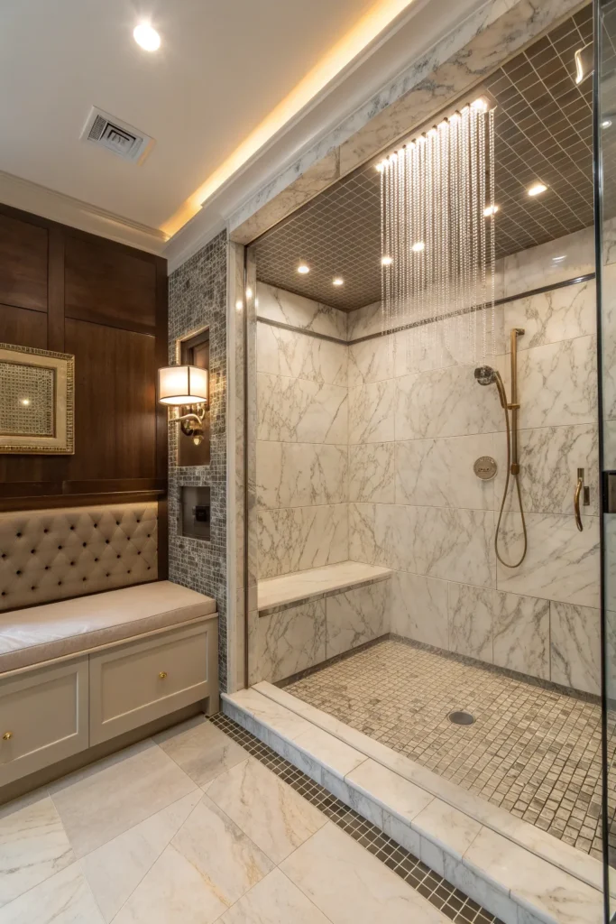 A walk-in shower feels resort-worthy, especially when paired with a built-in bench for comfort. This feature enhances relaxation and makes the shower safer and more functional.