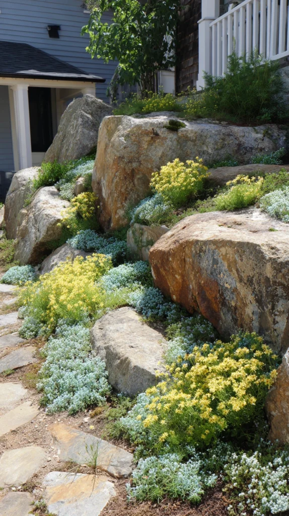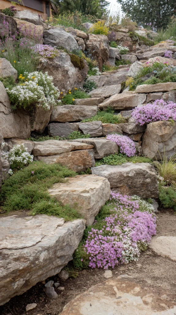 A sloped or uneven area in your yard, which might seem like a design challenge, is actually a perfect candidate for a rock garden. Using flat stones or fieldstones to create terraced levels, you can stabilize the slope while creating distinct planting pockets at each tier. Fill these tiers with creeping plants like phlox, alyssum, or creeping jenny to soften the hard edges and create a cascading, layered look.
