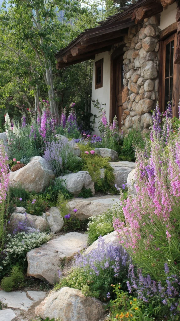 For a more romantic, informal look, a rustic cottage-style rock garden uses irregular fieldstones and old, weathered rocks to frame a mix of colorful flowering plants. Lavender, foxglove, catmint, and roses growing freely among scattered stones create a charming, unstructured feel that is full of character. This style suits older homes and gardens with a traditional aesthetic, and it softens the rigid geometry often found in smaller plots.