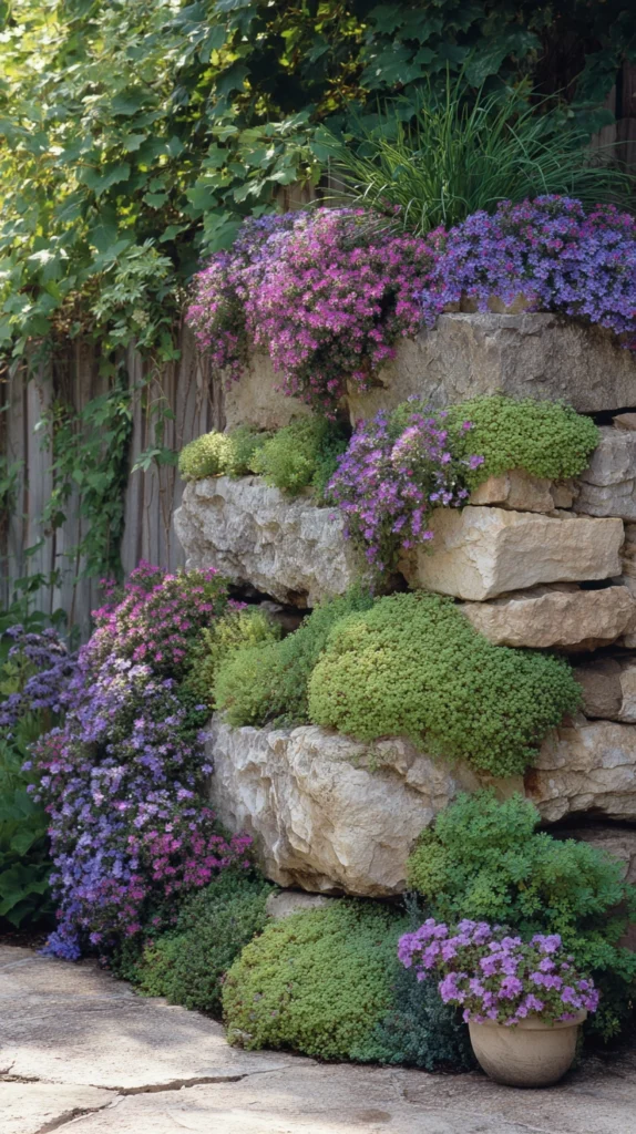 When horizontal space is limited, go vertical. A dry-stacked stone wall built along a fence or boundary can double as a planting surface. Fill the gaps between the stones with soil and tuck in small plants like aubrieta, wallflowers, and sedums. Over time, plants will spill over the edges and cascade down the wall, creating a living tapestry of color and texture that takes up virtually no floor space.