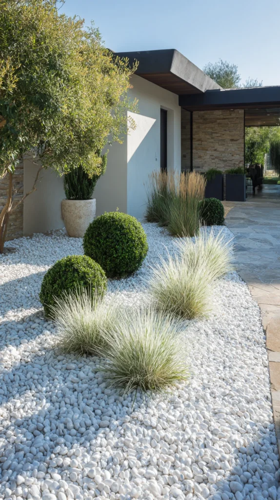 For contemporary homes, a minimalist rock garden using clean lines, uniform gravel, and a restrained plant palette creates a sophisticated outdoor space. Choose a single type of stone — such as slate, white quartz, or dark basalt — and pair it with architectural plants like ornamental grasses, agapanthus, or simple topiary. The result is a garden that feels intentional, curated, and visually striking without ever feeling cluttered.
