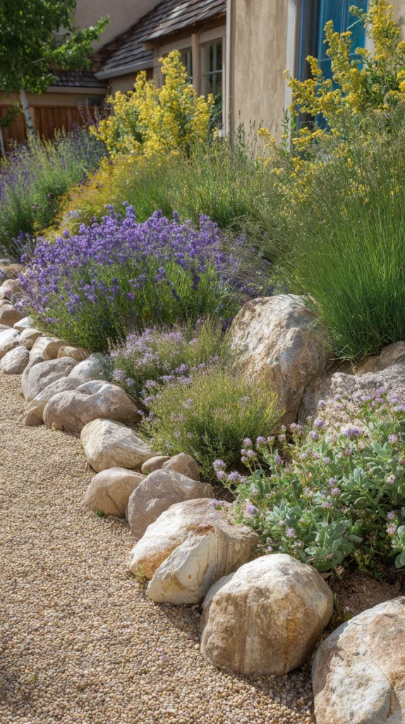 If a full rock garden feels too ambitious, start smaller by replacing a traditional garden border with a rock-lined one. Line the edges of your garden beds with stones of varying sizes, fill in with gravel mulch, and plant drought-tolerant perennials within. This approach reduces weeding, improves drainage, and gives your garden a structured, polished look with very little ongoing effort.