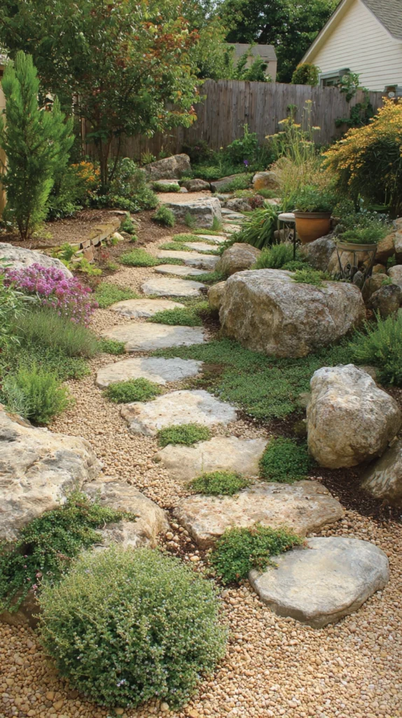 A rock garden does not have to be a standalone feature — it can also serve a practical purpose. Designing a pathway using stepping stones surrounded by small pebbles, ornamental gravel, and low-growing plants turns a functional walkway into a beautiful garden feature. Moss, creeping thyme, or woolly thyme planted between the stones adds softness and fragrance underfoot, making every step a sensory experience.