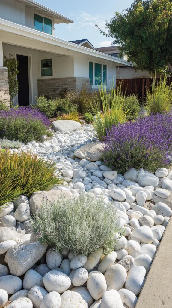 Inspired by the shoreline, a coastal pebble garden uses smooth, rounded stones in neutral tones — white, grey, beige, and charcoal — to create a clean, contemporary aesthetic. Pair the pebbles with ornamental grasses, lavender, and sea holly for a windswept, coastal feel. This style works particularly well in modern gardens and suits small front yards where low-maintenance curb appeal is a priority.