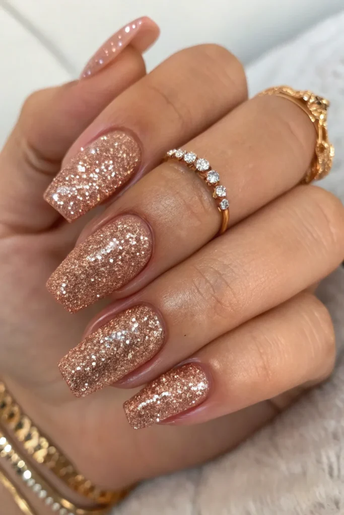 Nothing beats the timeless beauty of full rose gold glitter nails. The sparkling finish catches light from every angle, giving your hands a luxurious, glowing look.