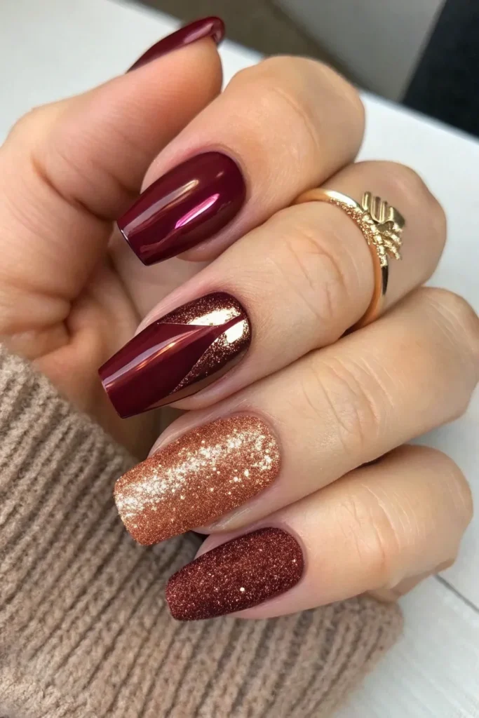 Pairing rose gold with deep burgundy creates a luxurious contrast that feels bold yet feminine. The warm metallic against a rich, dark shade adds dimension and glamour.