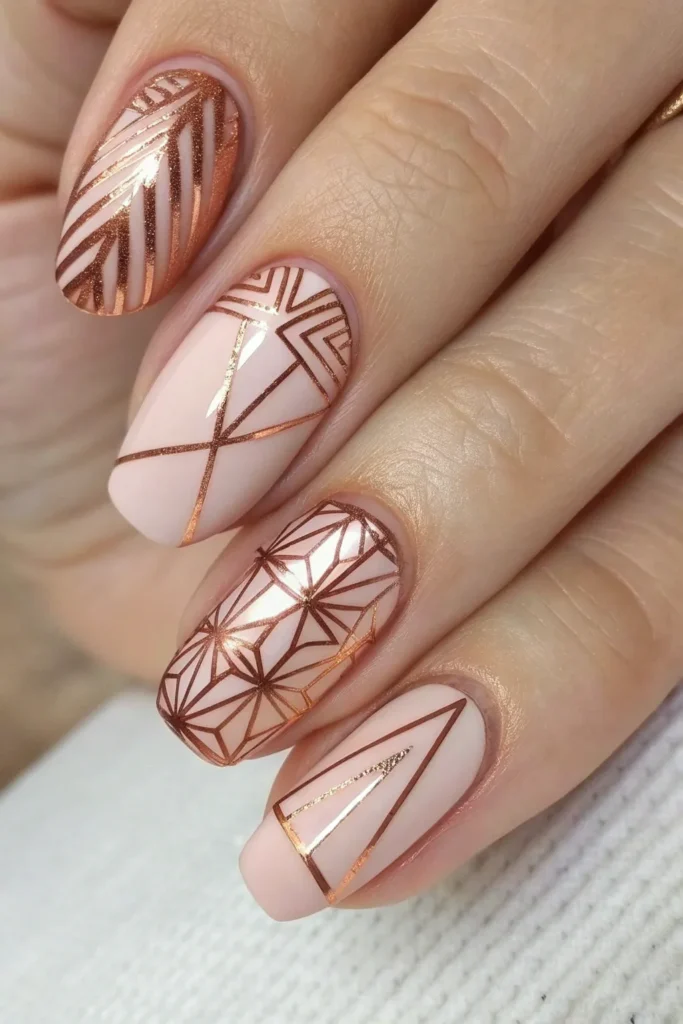 Geometric lines and shapes in rose gold foil or polish over a nude base make a modern and artistic statement. The sleek metallic finish brings structure to an otherwise soft, romantic tone.