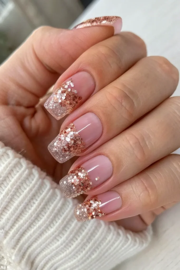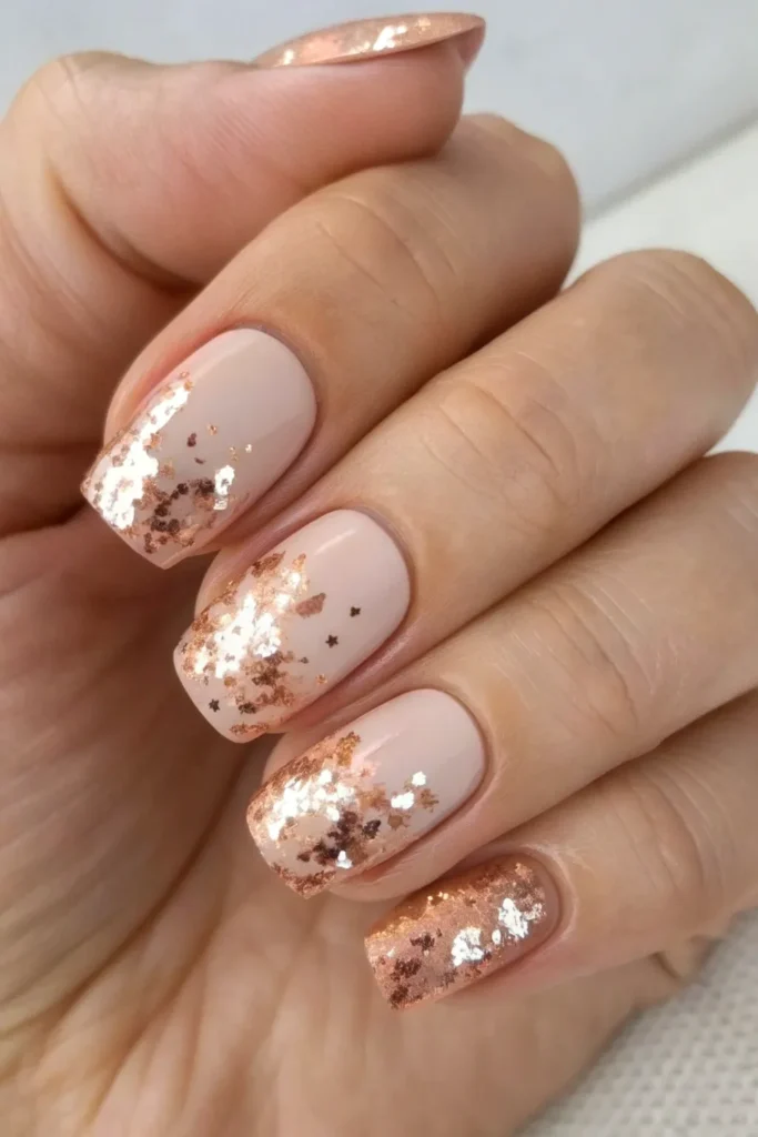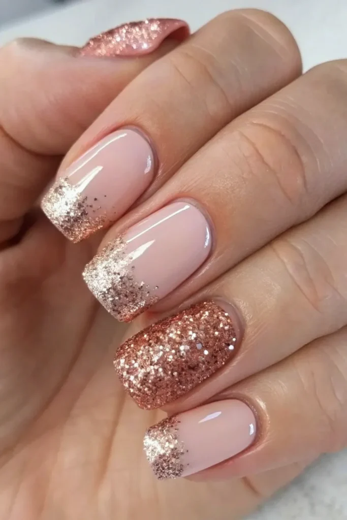 Ombre nails fading from nude or blush pink to rose gold glitter are effortlessly chic. The gradual transition adds depth and makes your nails look longer and more refined.