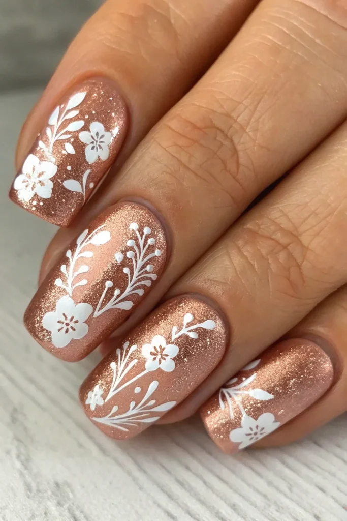 White floral details painted over a rose gold base bring a romantic, feminine touch. The combination of shimmer and soft white makes this design perfect for weddings, parties, or special occasions.