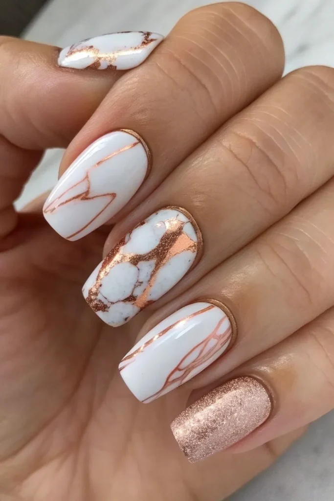 This combination of white and rose gold marbling creates a stunning, sophisticated effect. The soft pink-gold streaks flow through the white base, resembling luxurious stone patterns.