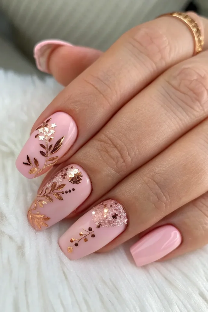 A soft pink manicure with rose gold accents—like lines, dots, or tiny glitter patches—creates a romantic and polished look. The mix of tones keeps it gentle yet eye-catching.