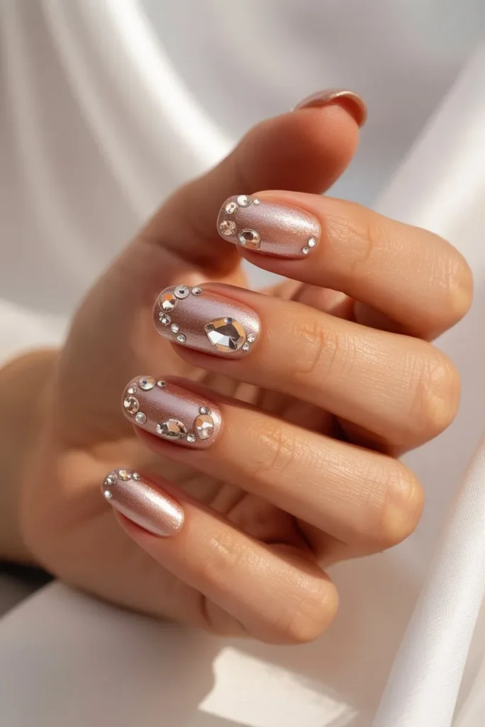 For full-on glamour, rose gold nails adorned with crystals and rhinestones are breathtaking. The sparkle from both the polish and the stones creates a statement look that’s pure luxury.
