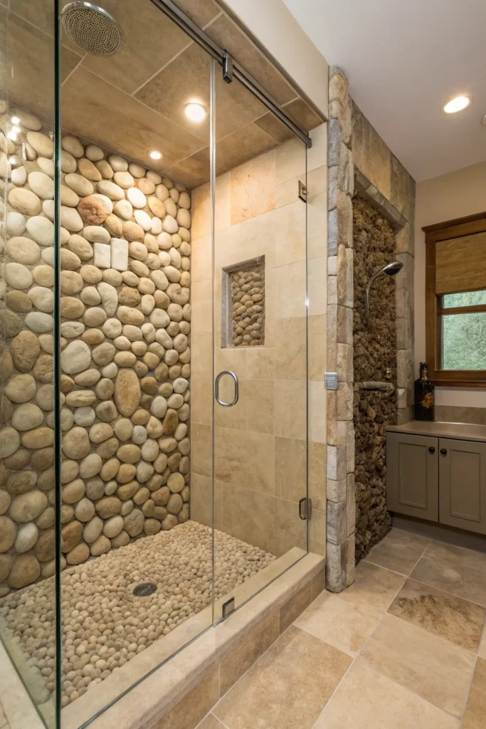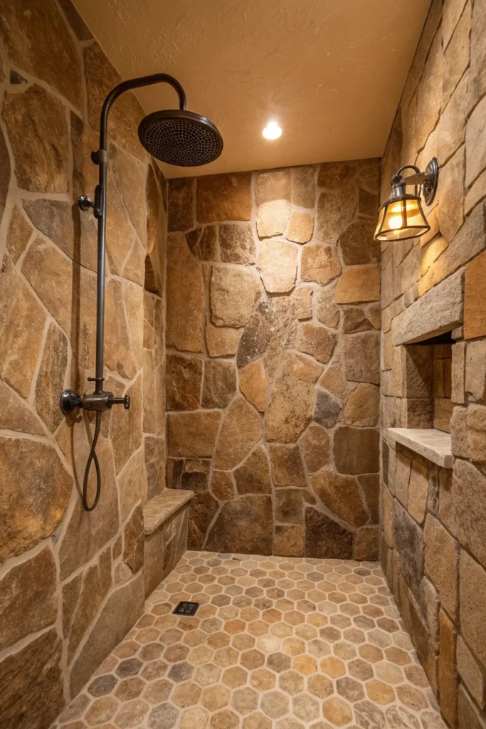 Floor-to-ceiling stone tiles instantly bring rugged charm and natural texture to your shower. Choose irregular stone shapes, slate tiles, or tumbled riverstone for a raw, earthy feel.