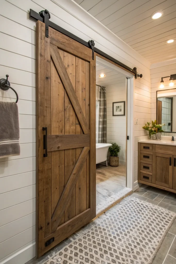 Instead of a traditional glass door, create a rustic entry using a sliding barn-style door outside the shower zone. It instantly adds character and farmhouse appeal.